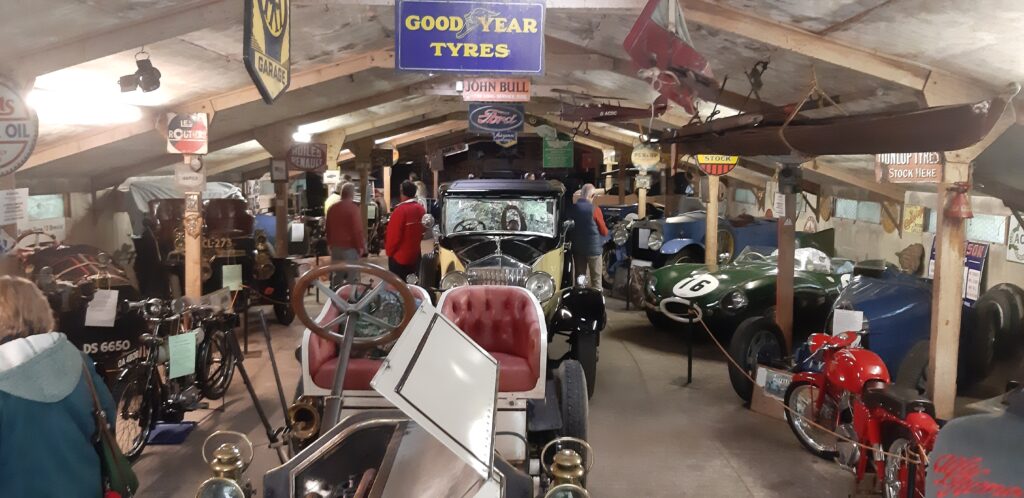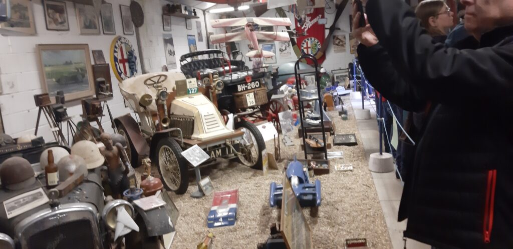 A good turn out gathered at 10.00 on the Sat morning for our tour of the collection of cars, boats which was originally put together by the late Paul Foulkes Halbard and is now being continued by his son Karl Foulkes Halbard. A private collection houses many exhibits. Including a 1903 chain driven Mercedes, the collection contains the very rare 1898 Orient Express (one of only two left working in the world), a 1907 Corbin Racer, several Bugatti cars, a fantastic 1904 chain driven Mercedes racing car, numerous motor cycles and many, many more. The centre of the collection is Sir Malcolm Campbell’s Bluebird K3 world record breaking boat which the Halbard family saved and restored, along with other famous Campbell cars, boats and memorabilia. The tour lasted a couple of hours and halfway through, we enjoyed some bacon rolls, home made rolls, and home made cakes and other yummy treats! After which we were given a talk by Karl, telling us about the story behind the restoration which finally led to being able to run K3 on the Swiss end Lago Maggiore from Locarno, where the original record was achieved.