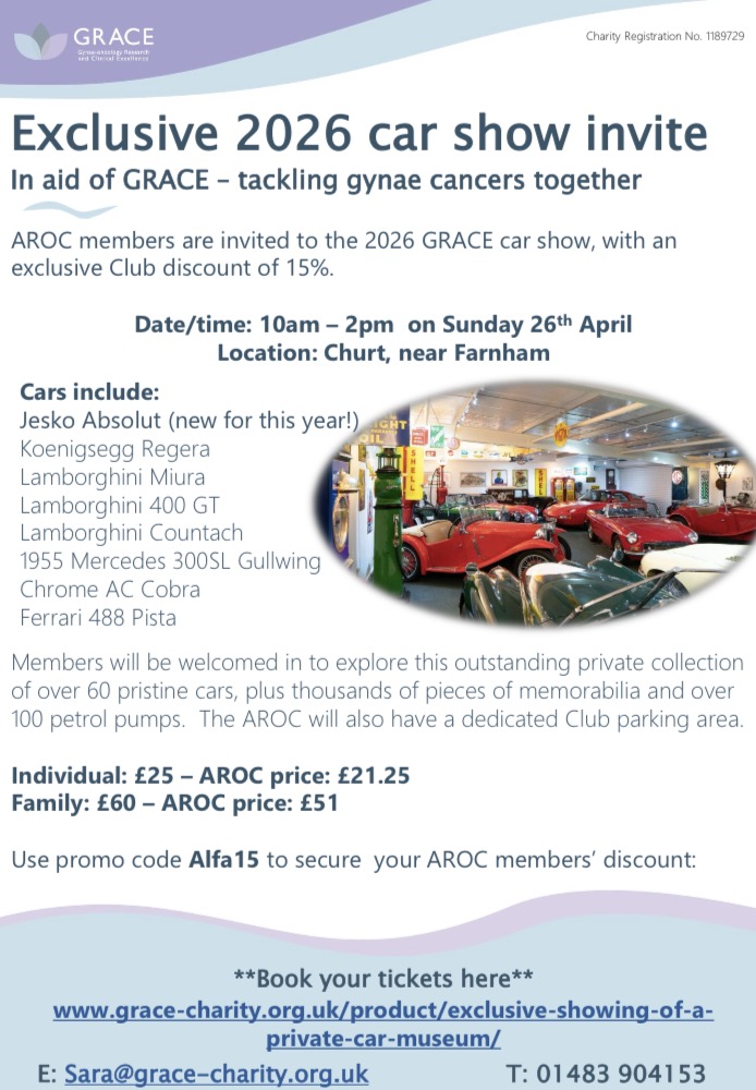 The Surrey section of the Alfa Romeo Owners Club meets monthly on the third Monday of the month (except December). The location of the meeting rotates between The Star in Malden Rushett, on the A243, less than 1 mile north of Junction 9 on the M25 and at the Seahorse in Shalford, on the A281 just outside Guildford. You can contact the Section via the committee (Grant Richardson, Geoff and Kim Kitson, and Anton Eve) using arocsurrey@gmail.com.