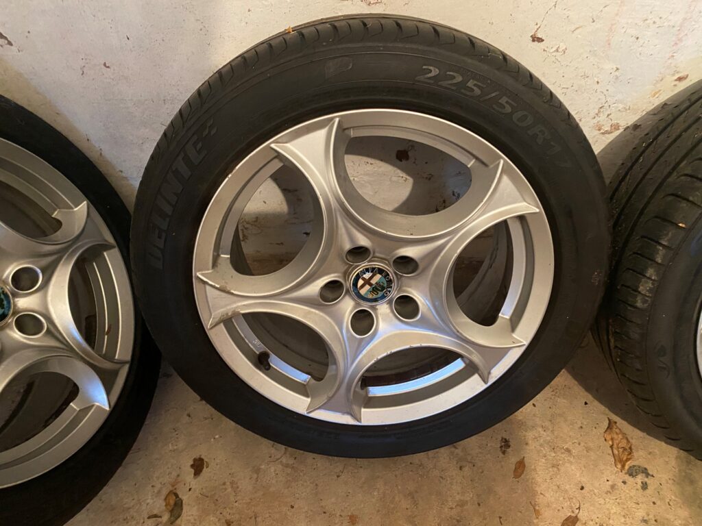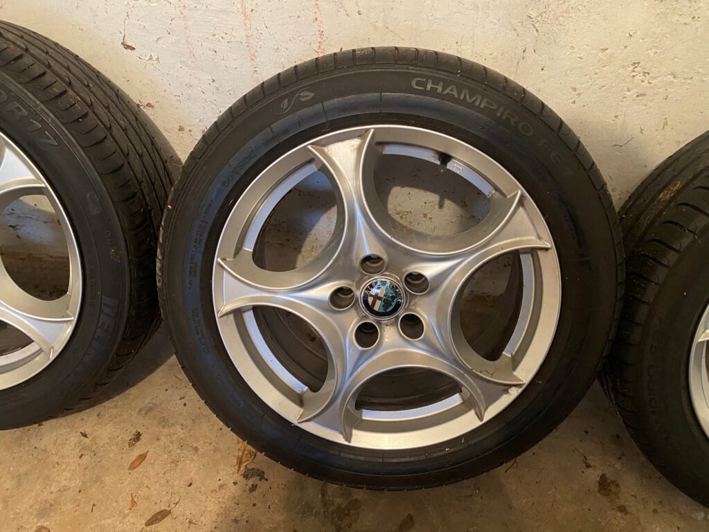 Four alloy wheels and tyres originally designed for a 2008 Alfa Romeo Spider. 17 inch diameter, 225mm width and aspect ratio of 50. Champiro tyres. The wheels are in very smart but not perfect condition. The tyres have loads of tread left.