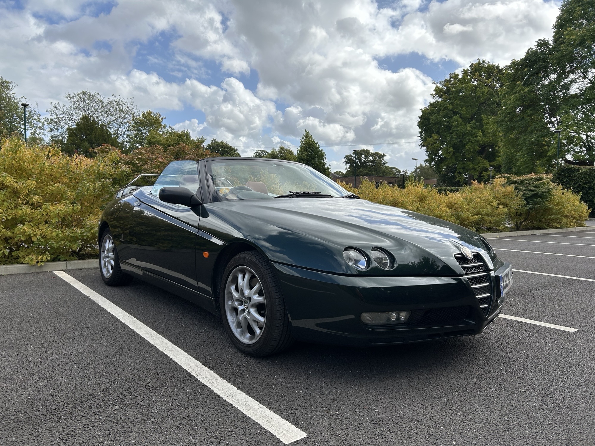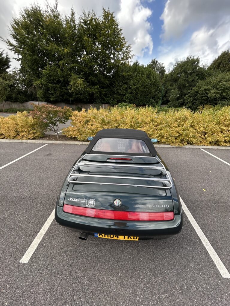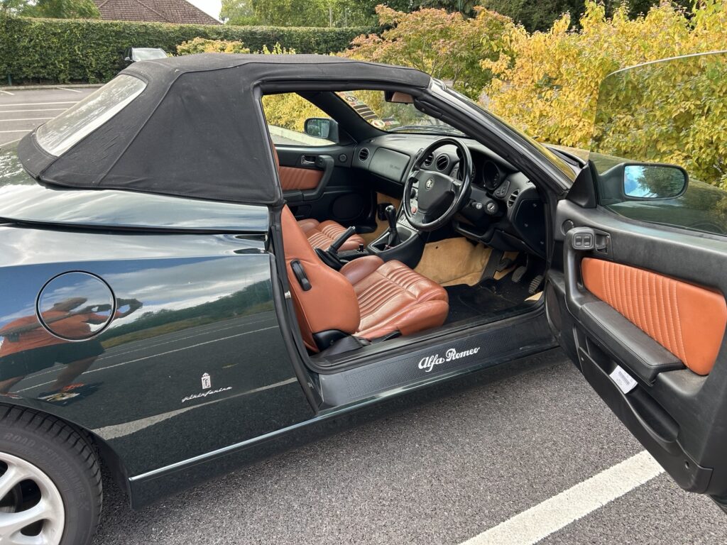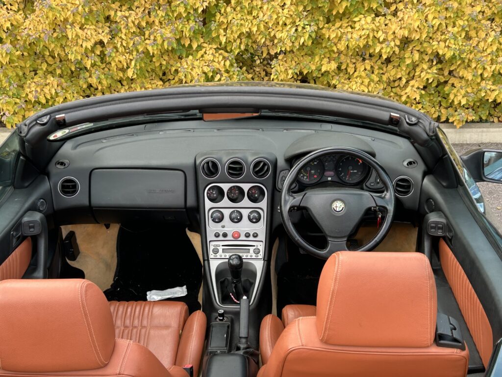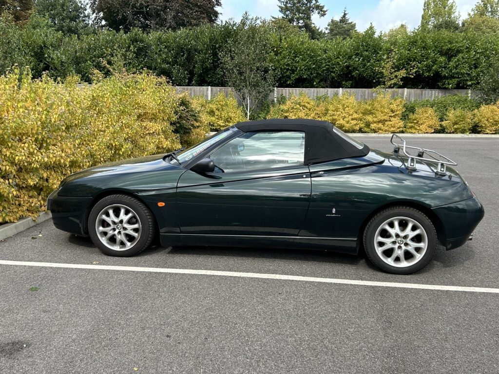 A beautiful example of this Italian icon in rare green coachwork with tan leather seats. 72500 miles. MoT valid until end of May 2026. The bodywork is in very good condition and all electrical features (power hood, lights, air con, radio/CD player, wipers) all operating correctly. Car is fitted with official Alfa luggage rack which also has a detachable weatherproof cover. Car is garaged when not in use.