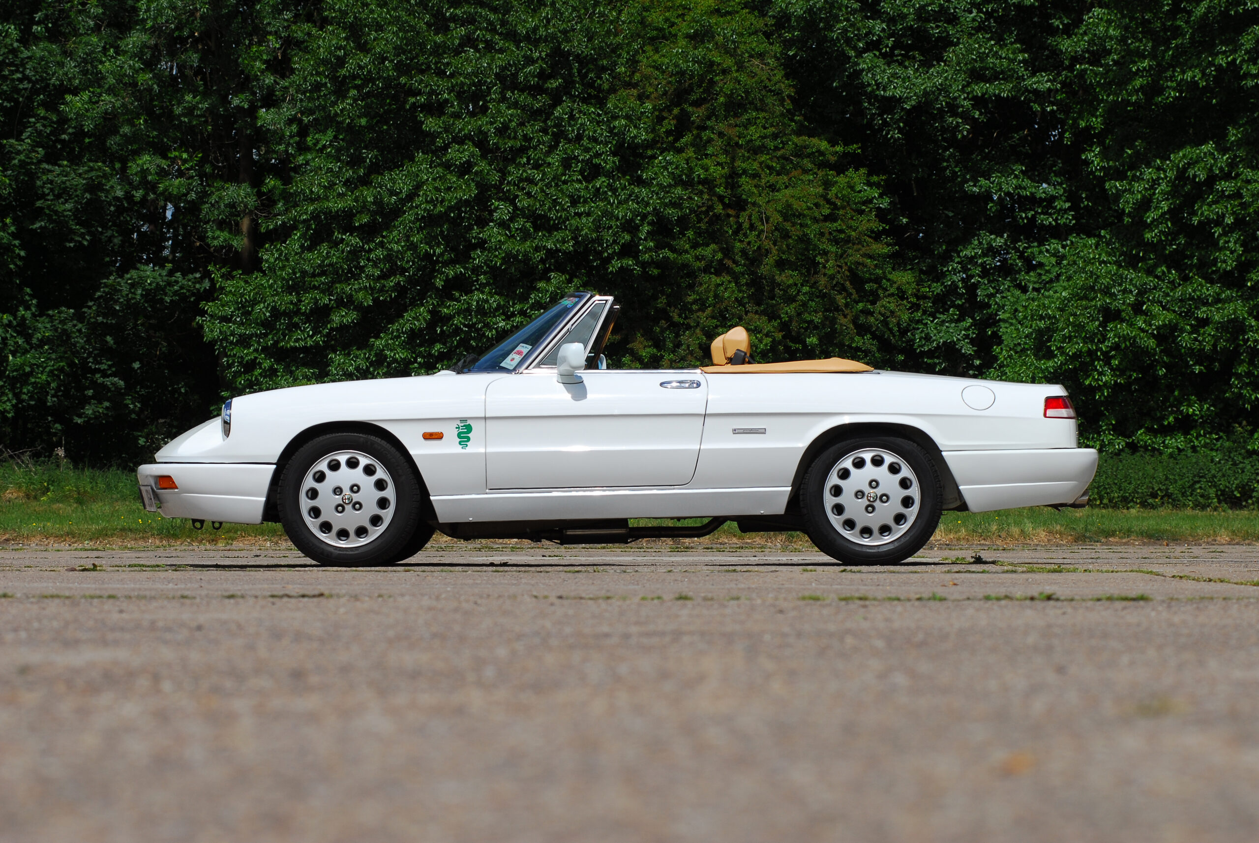 Immaculate example of this appreciating, LHD Alfa Romeo Spider S4 presented in an amazing bright white with tan seats trimmed in alcantara. Bodywork and alloys in original, excellent condition with the original hood and unmarked hardtop. Garaged all year round, serviced regardless of cost and in superb mechanical condition. History file. AROC Concourse winner