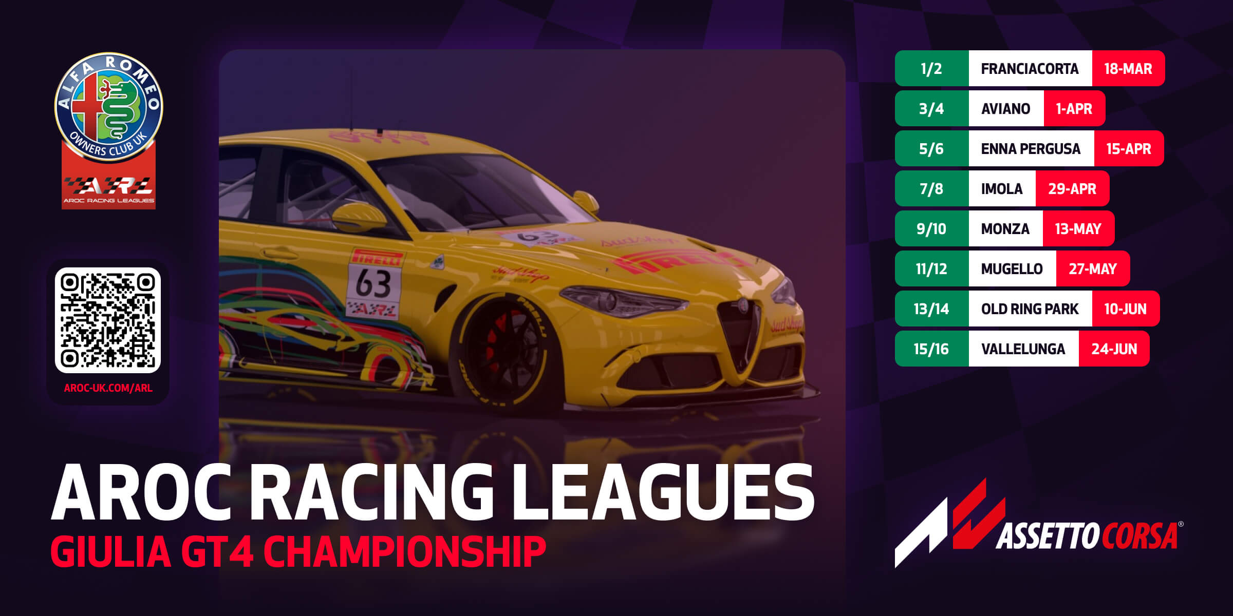 We’re excited to launch a brand‑new AROC sim‑racing series for 2026 — the Giro D’Italia Esports Series, a celebration of Italian motorsport passion, Alfa Romeo heritage, and competitive sim racing. The series will run on Assetto Corsa (PC – Steam) and is open to all AROC members and invited guests.